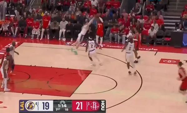 第一节比赛中,阿龙-霍勒迪撤步三分投进,火箭打出一波11-2领先湖人5分。